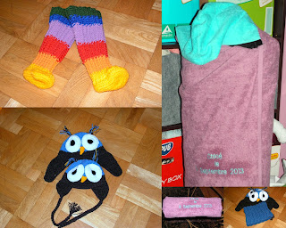 2 sowie czapy dla barciszków dwóch, golfik dla starszego i kapciogeterki do chusty dla kolegi/koleżanki. I coś szyciowego -ręczniczek z kapturkiem, rozmiar uniwersalny.
